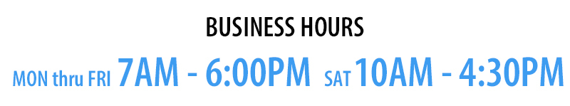 Monday thru Friday 7:30am-6pm Saturday 9am-5pm Sunday Closed |