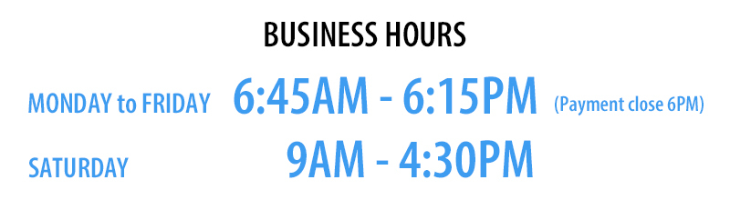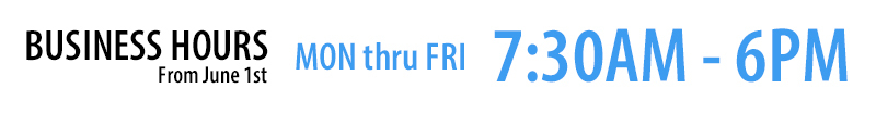 Monday thru Friday 7:30am-6pm Saturday 9am-5pm Sunday Closed |