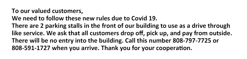 We need to follow these new rules due to Covid 19. There are 2 parking stalls in the front of our building to use as a drive through like service. We ask that all customers drop off, pick up, and pay from outside. There will be no entry into the building. Call this number 808-797-7725 or 808-591-1727 when you arrive. Thank you for your cooperation.